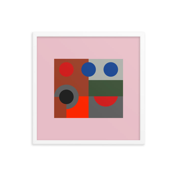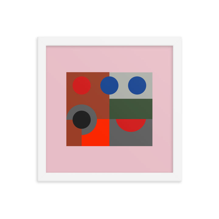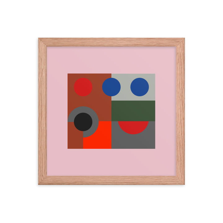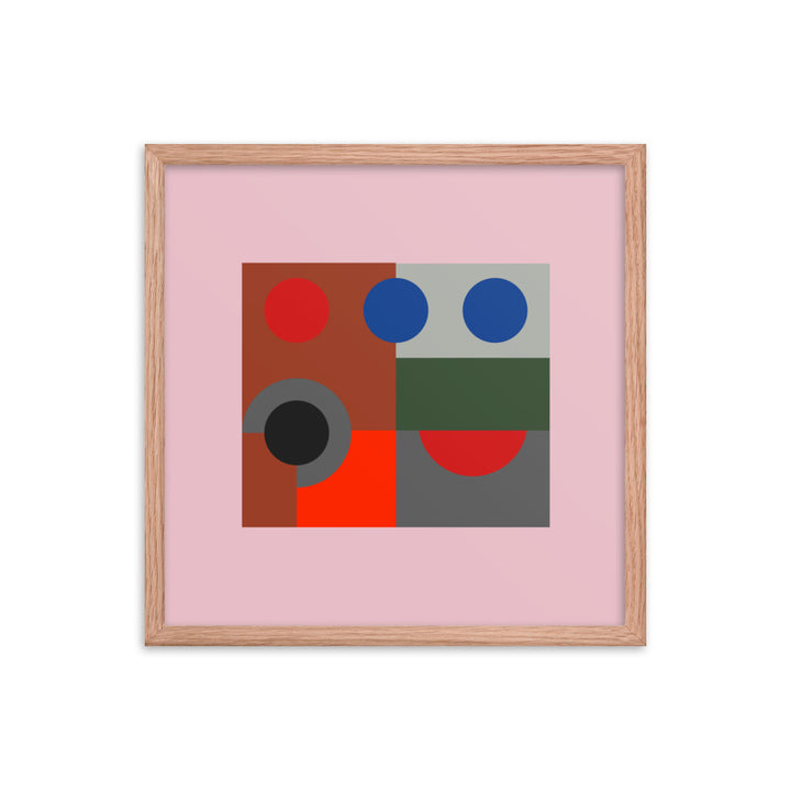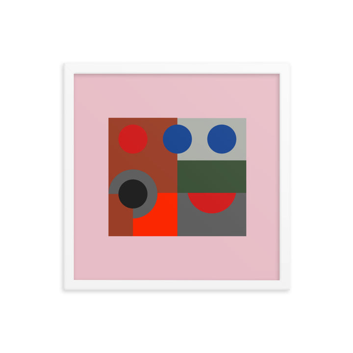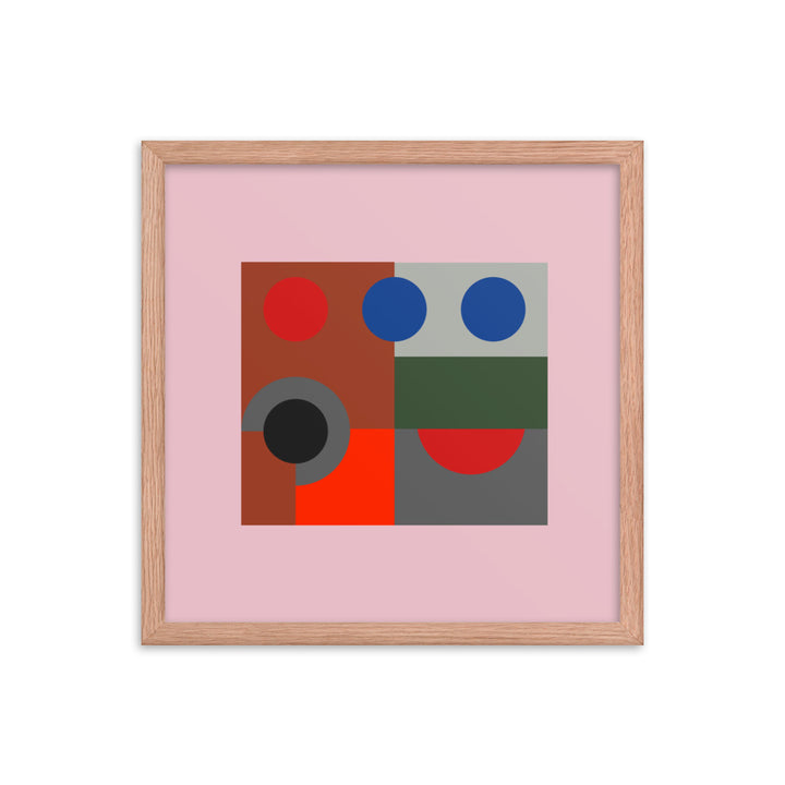Circles of various sizes and colors are strategically placed across the composition, reminiscent of architectural blueprints or urban planning from a bird's-eye view. Two large blue circles sit atop each half, almost like watchful eyes over the constructed scene. The use of circles within squares and against flat colors creates a layered effect, adding depth and interest.