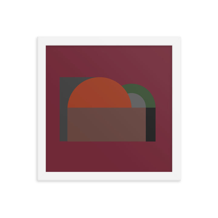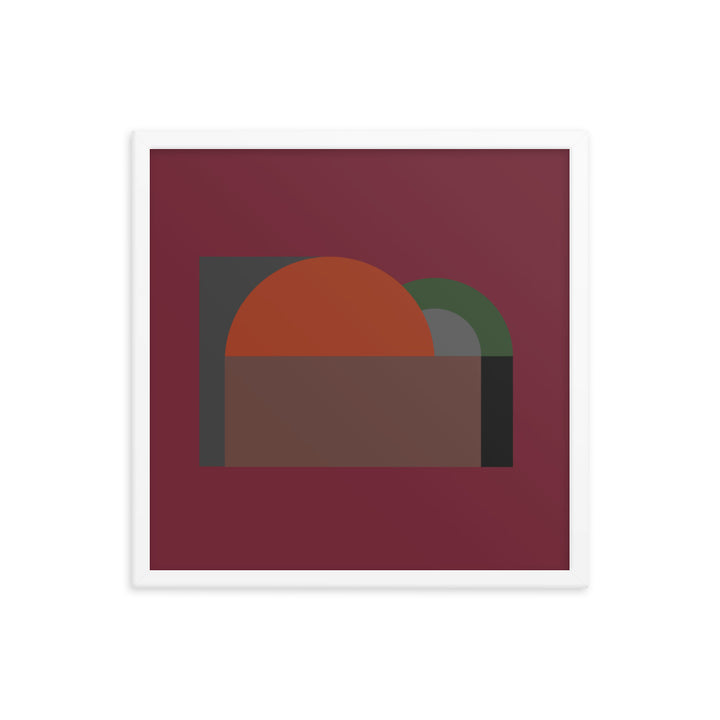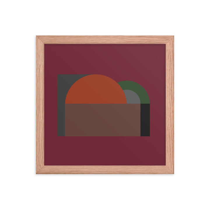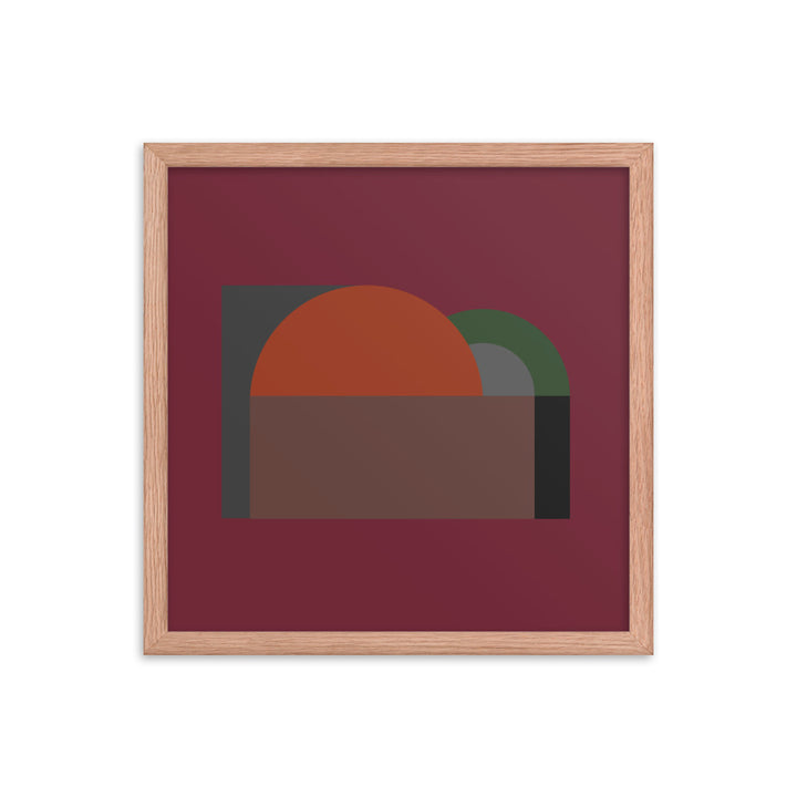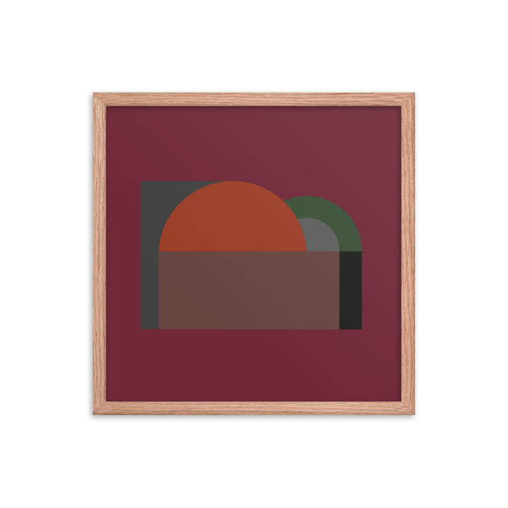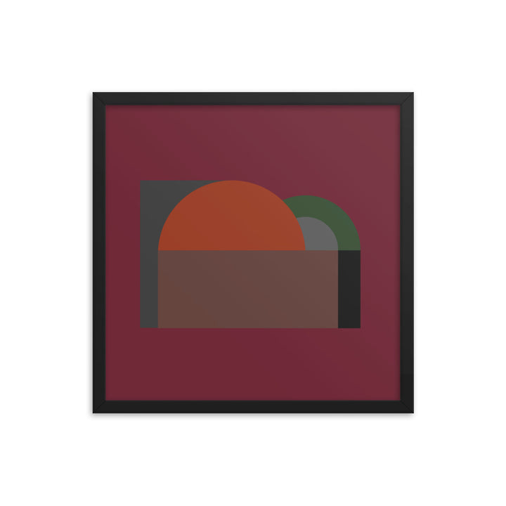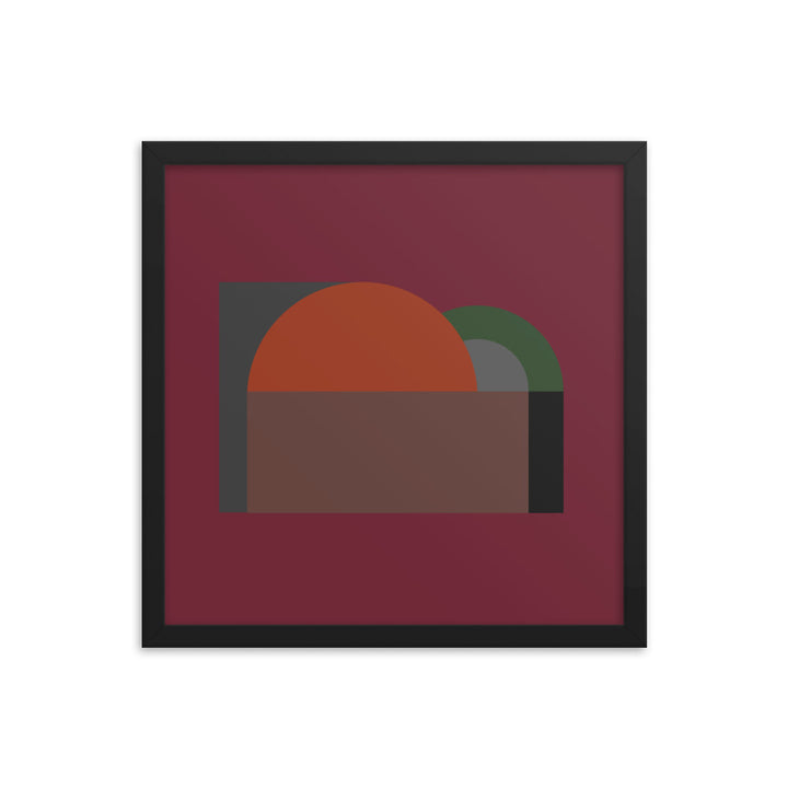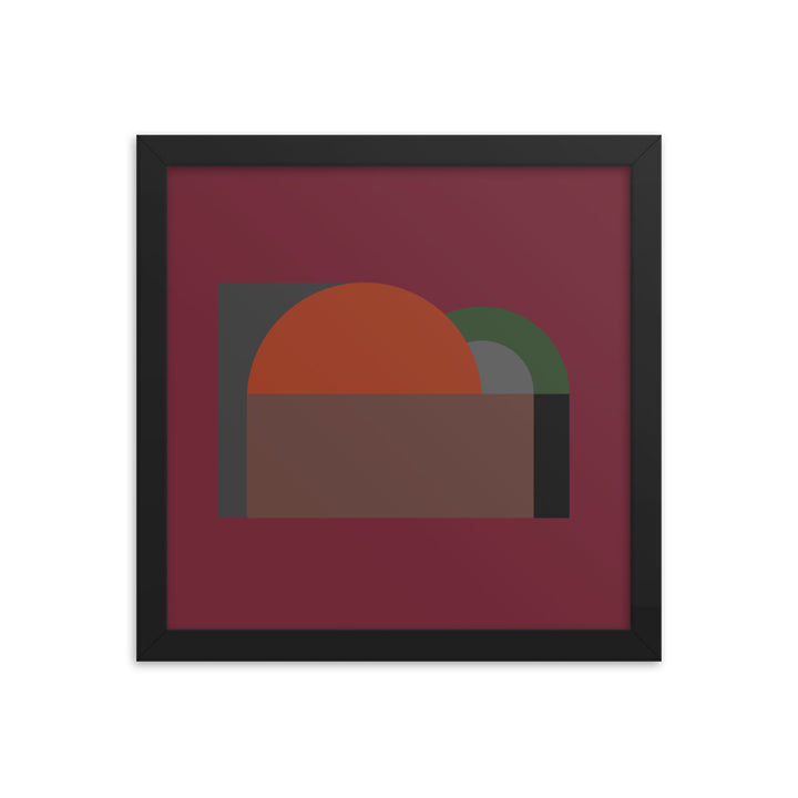 A large semi-circle in a vivid orange hue commands the canvas, setting a stark contrast against a dark, almost black background. This central figure is cradled by a half-rectangle of brown, suggesting a horizon or landscape of sorts, grounding the composition. Adjacent to it, a smaller, muted green semi-circle overlaps the orange, introducing a sense of depth and interaction between the elements.