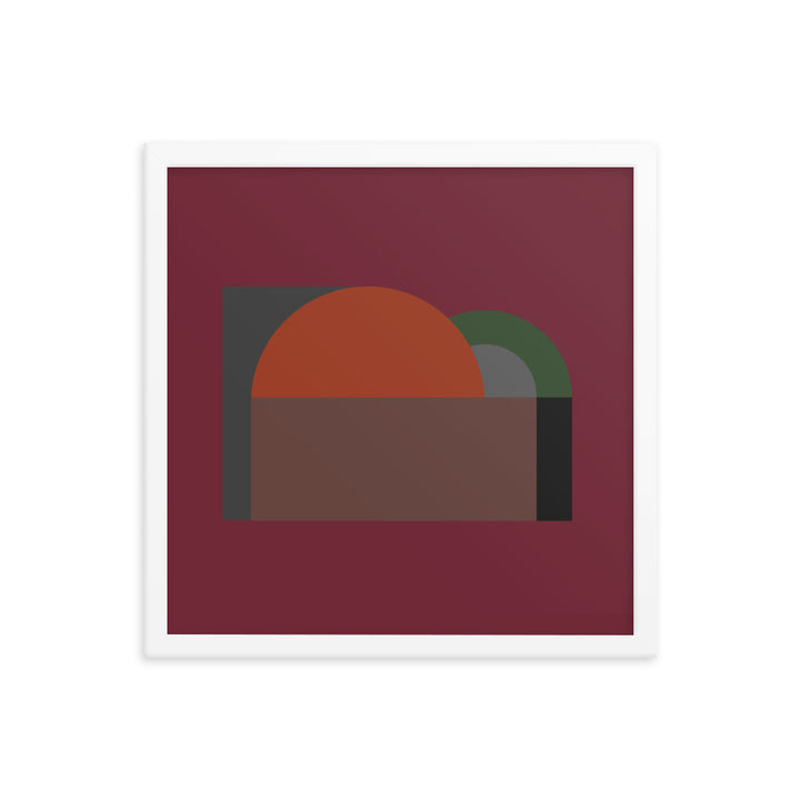 The artwork depicted in the image is an abstract composition, again reflecting the strong influence of architecture in its design. The piece is characterized by a bold interplay of geometric forms and a deep, moody color palette.