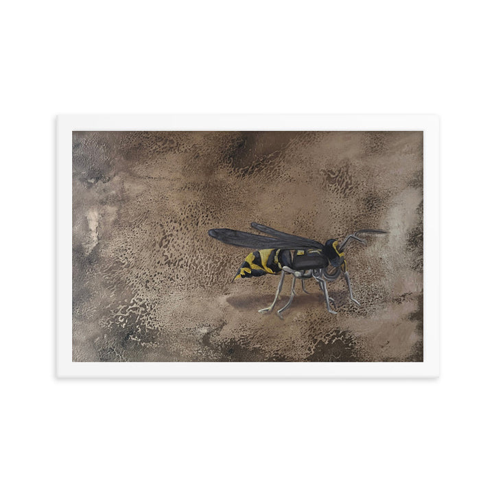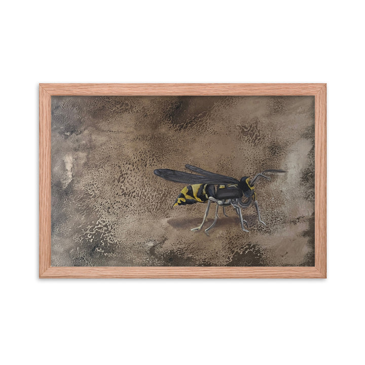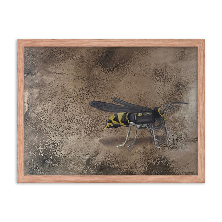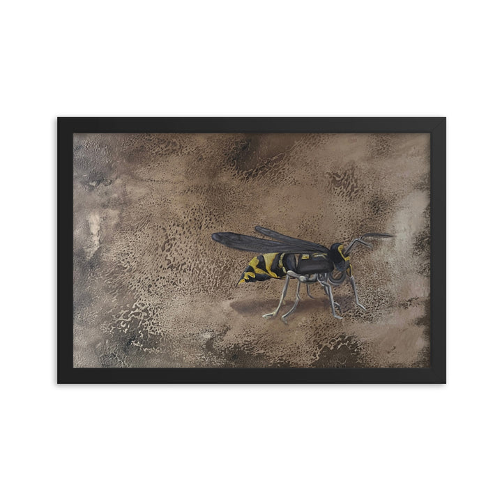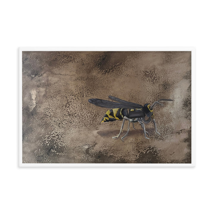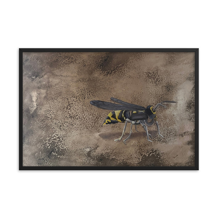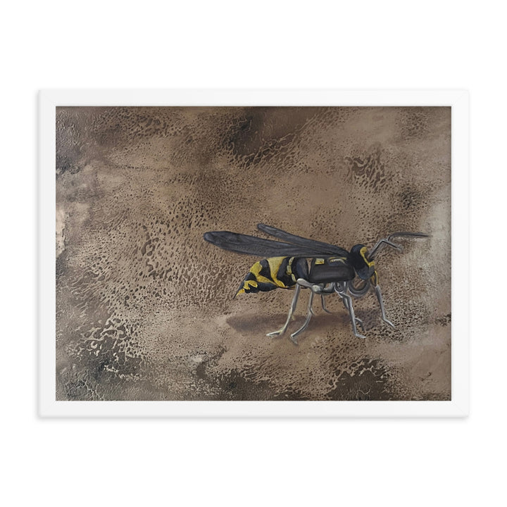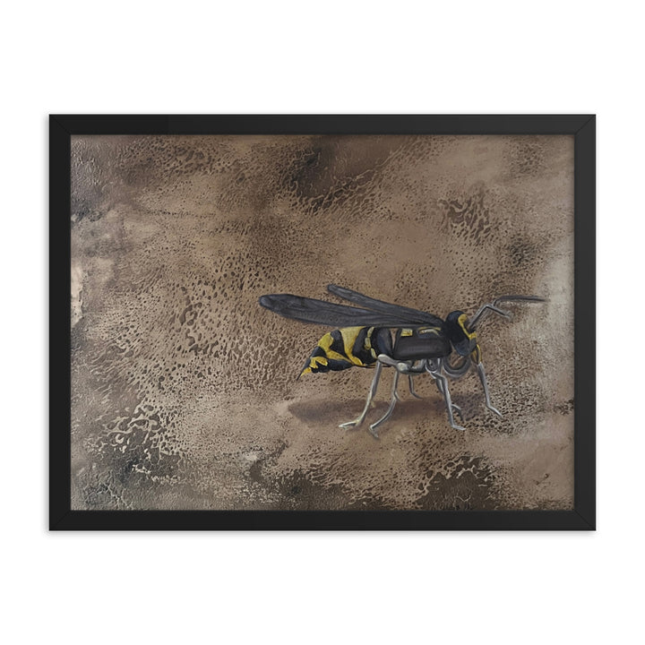 In her captivating figurative artwork, "Empantanada," Ercilia Cepeda delves deep into the essence and urgency of environmental consciousness. This piece features a meticulously rendered bee, set against a richly textured, cracked brown background, symbolizing the fragile yet vital world bees inhabit. Through this artwork, Cepeda not only celebrates the beauty and importance of bees but also poignantly highlights the perils they face. Each crack in the background echoes the breaking of the natural order, while the bee's vivid depiction serves as a reminder of life's interconnectedness and the urgency to protect these essential creatures.Make a statement in any room with this framed poster, printed on thick matte paper. The matte black frame that's made from wood from renewable forests adds an extra touch of class.