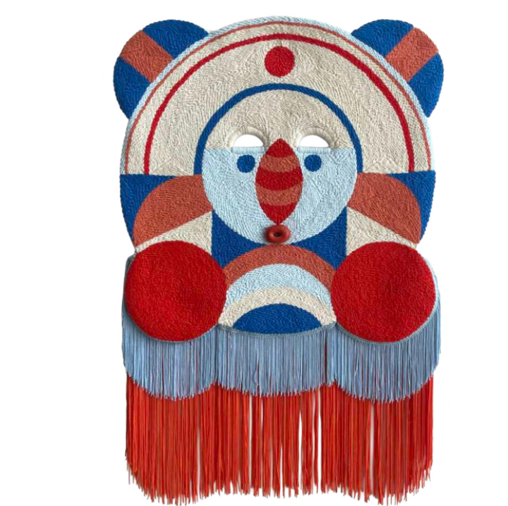 Hand-embroidered with cotton thread on linen and accented with ceramic pieces, this piece blends geometry, ritual, and playfulness in a bear-like figure that reflects the duo’s surreal and symbolic visual language.