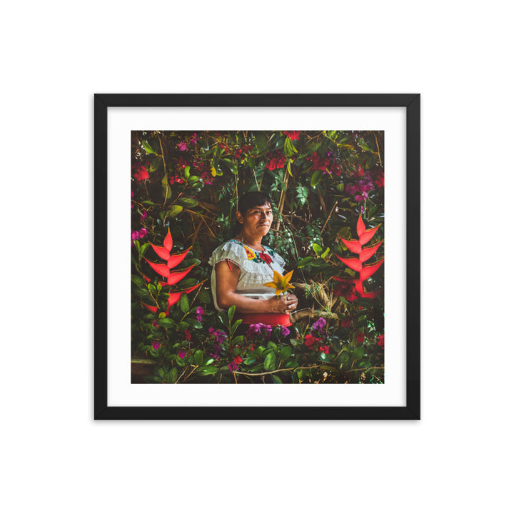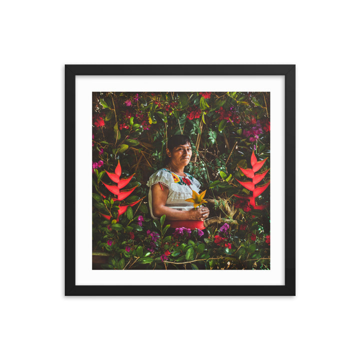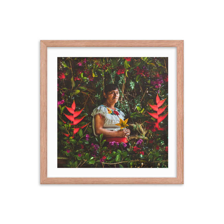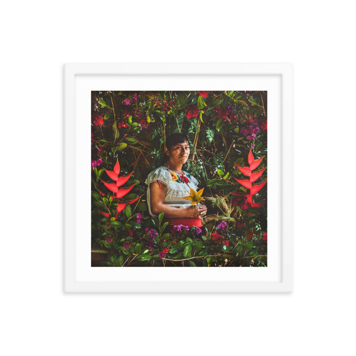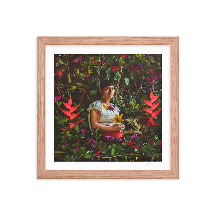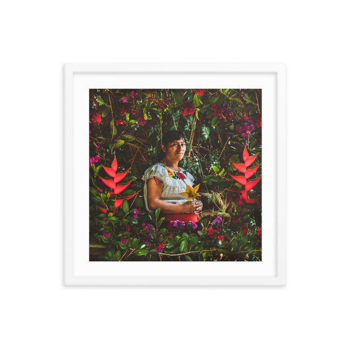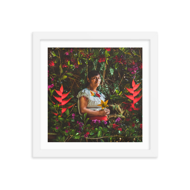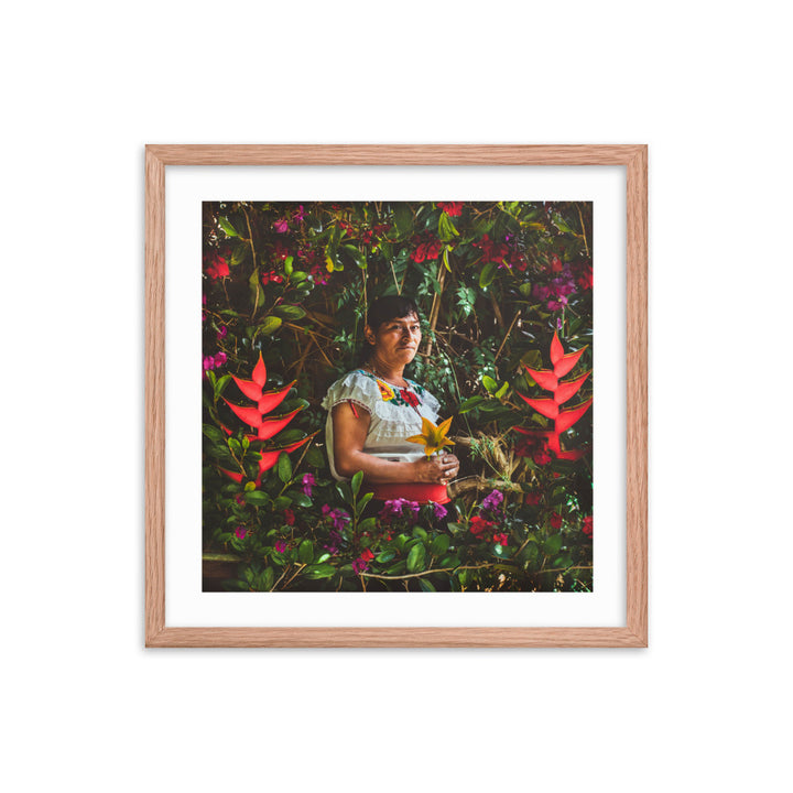 "María en la Milpa," a stirring piece by Gonzalo Gato, pays tribute to the enduring spirit of the Chiapaneca woman, whose toil and connection to the land are as rich as the soil she cultivates. Surrounded by a lush tapestry of flora, María is the embodiment of resilience and grace. She sits enshrined within the vibrant greens and florals of her milpa, a testament to the sustainable practices of pre-Hispanic permaculture.